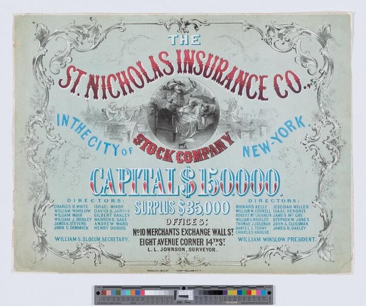 Image of an eye-level view of a smoking Mount Aetna with buildings and sailboats along the coast of Sicily, Italy, in the foreground at the center of an advertisement for Aetna Insurance Company of Hartford, Connecticut; elaborate decorative frame and border highlighting cash capital and losses paid.