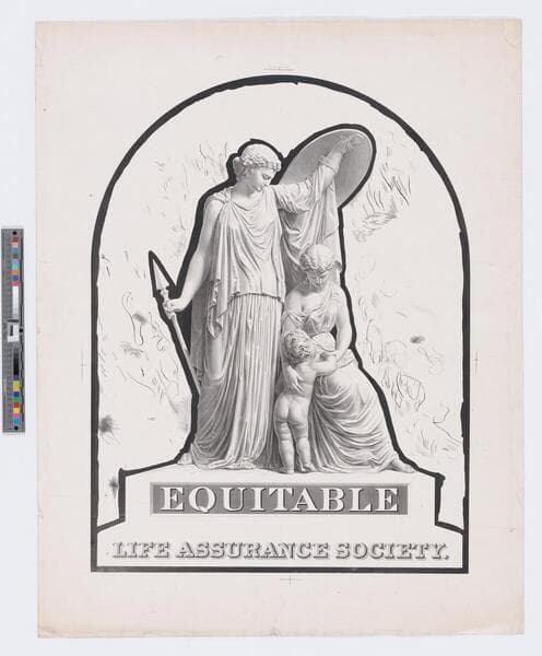 Image of an advertisement for Equitable Life Assurance Society of New York City; image of a marble statue of goddess Athena with a spear and upraised shield protecting a mother and her child.