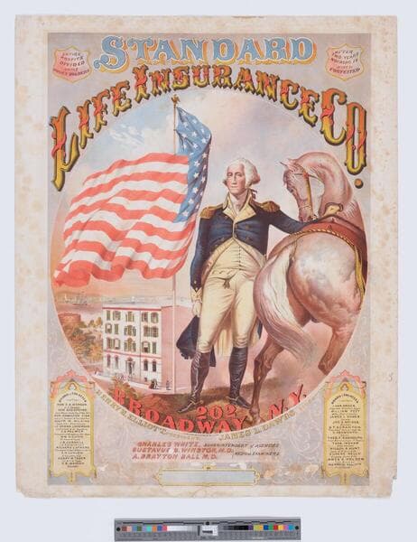 Image of an advertisement for the Harmony Fire and Marine Insurance Company of New York City; a boy stands at center with a lion, lamp, cat, and pair of doves in an oval floral frame; three women among palm trees, foliage, and flowers make a larger rectangular frame; American flag banners at top right and left; seascape of ships sailing near coastlines at bottom center.