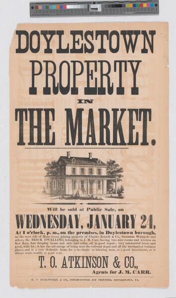 Image of a broadside advertising the auction of a farm in Doylestown, Pennsylvania, including land, buildings, livestock, agricultural machinery and implements, grain, and produce; images of barn and farmhouse, a cow, horse being led by a man, and pigs, surrounded by advertisement text.