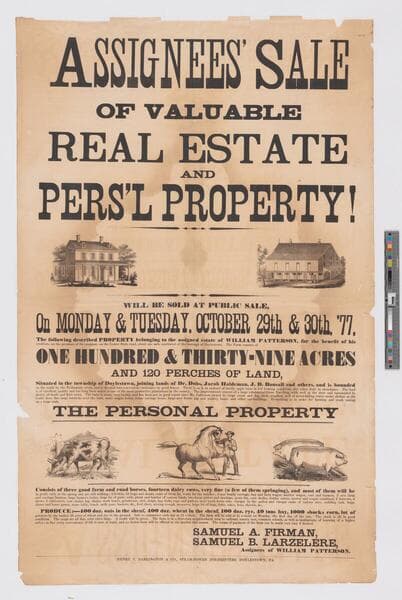 Image of a farm with livestock, farmhouse, barn, and farm workers on a diploma issued by the New York State Agricultural Society; sheaves of wheat, livestock, and farm scenes including a man with plow and horses, a man harvesting grain, workers pulling a wagon full of hay, and a woman watering flowers form a border.