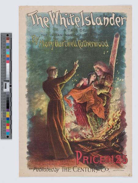 - Image of a woman huddling close to a man, who is tied up and being burned at the stake; a priest raises his hands to perform marriage rites for the couple before him.