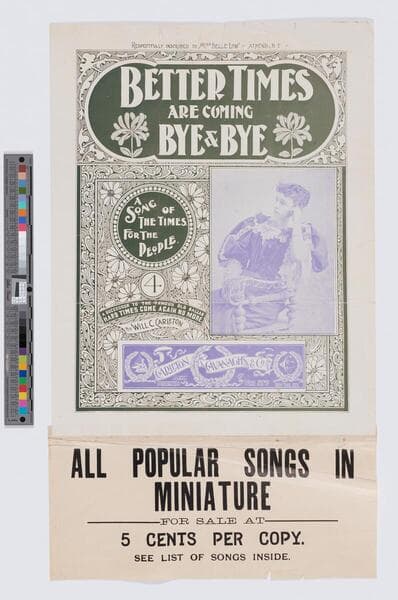 - Image of a sheet music advertisement for the song Better Times Are Coming Bye & Bye by Will C. Carleton; half-length portrait of a woman seated in a chair with her head resting on her hand; elaborate floral decorative border.