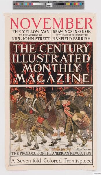 - Image of an advertisement for the Century magazine November 1903 issue; Revolutionary War soldiers trek through a snowy forest with guns, packs, and a drum.