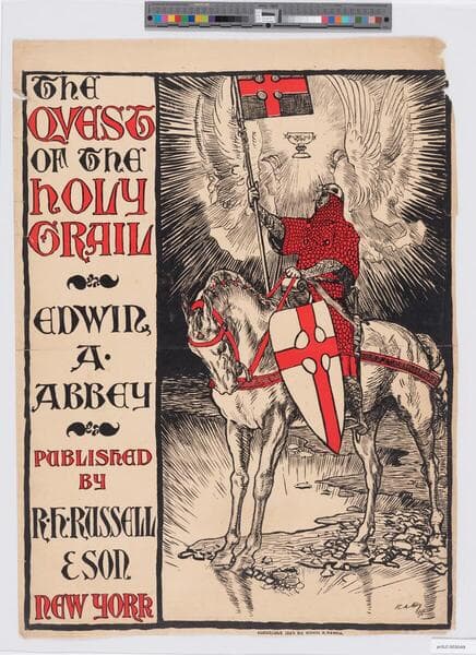 - Image of a knight Templar in chain mail holding a flag aloft while sitting astride a horse; above the knight's head two angels bow towards a glowing image of the Holy Grail chalice.