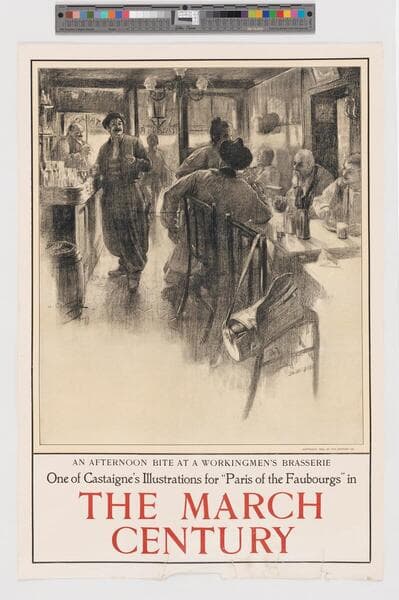 Image of an advertisement for the Century magazine March 1900 issue; interior view of a busy bar and restaurant in Paris, France, with people seated around a table eating and drinking, and a man standing at the bar talking to another man seated at a table.