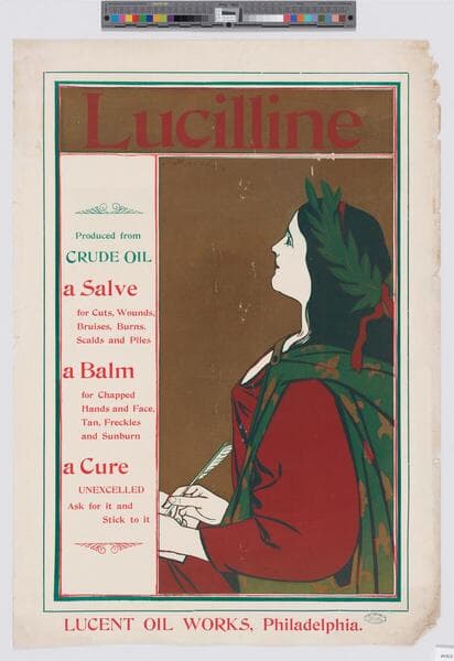 - Image of an advertisement for Lucilline balm made by Lucent Oil Work of Philadelphia, Pennsylvania; a woman in robes and a cape wearing a laurel wreath on the head sits and gazes upward raptly while holding paper and a quill pen on her lap.