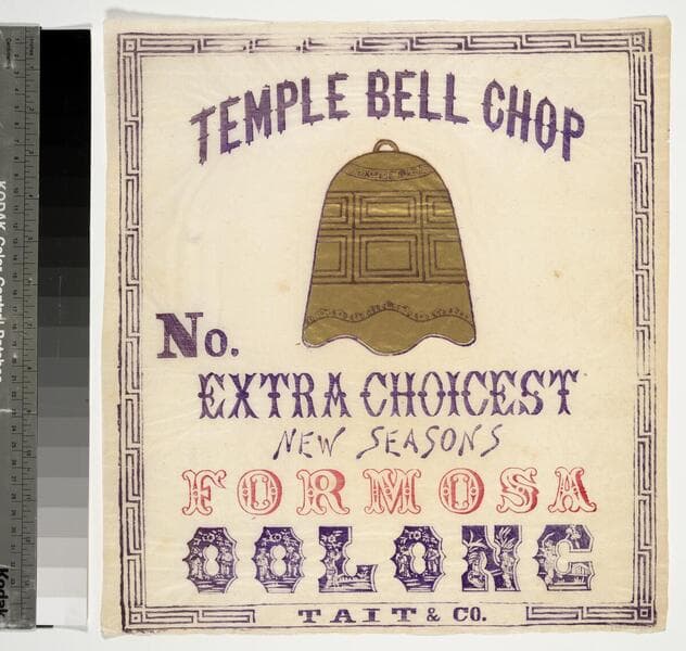 Image of a Tait & Co. tea label with Yin Yang symbol at center; text with elaborate decorative border made up of Chinese men and women in pagoda buildings engaging in various trades and leisure activities.