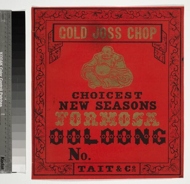 Image of a Tait & Co. tea label with temple bell at center; text with geometric decorative border.
