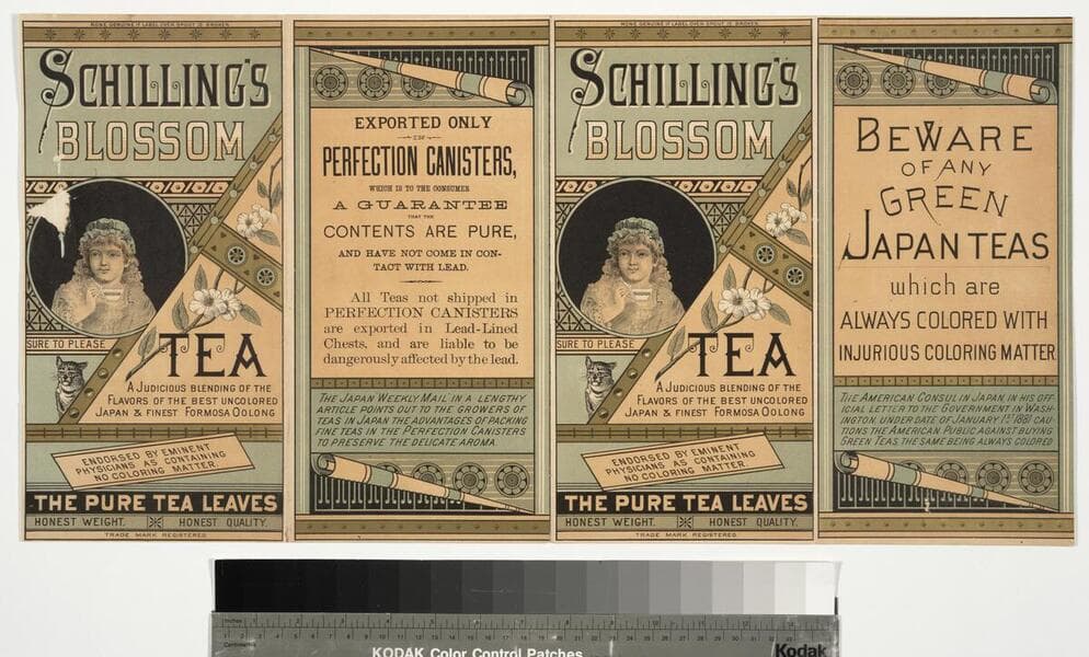 Image of a four-panel tea can label; cherubic child holding a torch and canister of tea on two panels; advertising text and ship at sea on two panels; decorative botanical border.