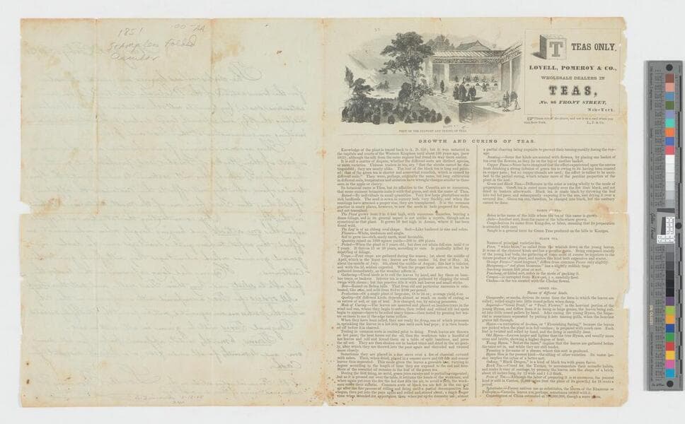 Image of a single-fold leaflet advertising teas sold by the Great American Tea Company of New York, New York; price list on verso; encapsulated with envelope enclosure with 1865 calendar printed on recto.