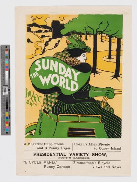 - Image of an advertisement for the Sunday World magazine May 24, 1896 issue; a man and woman seated in a horse-drawn cart ride through the countryside, the woman holding the reins; forest, winding path, and castle in background.