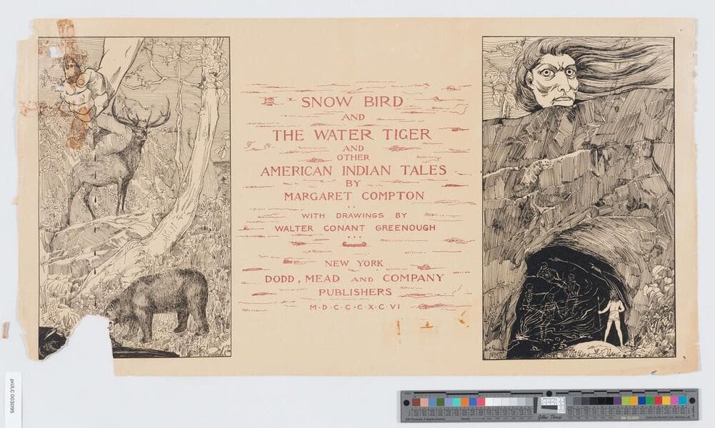 - Image of an advertisement for Snow Bird and the Water Tiger and Other American Indian Tales by Margaret Compton; two panels depict outsized Native American Indians interacting with a wild landscape; a large hand holds a fish above a forest with a deer and a bear near a stream at left; a large face with windswept hair peers over a rocky cliff face with a warrior at the mouth of a cave with skeleton apparitions inside at right.