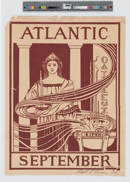 - Image of an advertisement for the Century magazine September issue; female figure dressed in chiton and mantle stands next to incense burner while holding a kylix; columns in background.