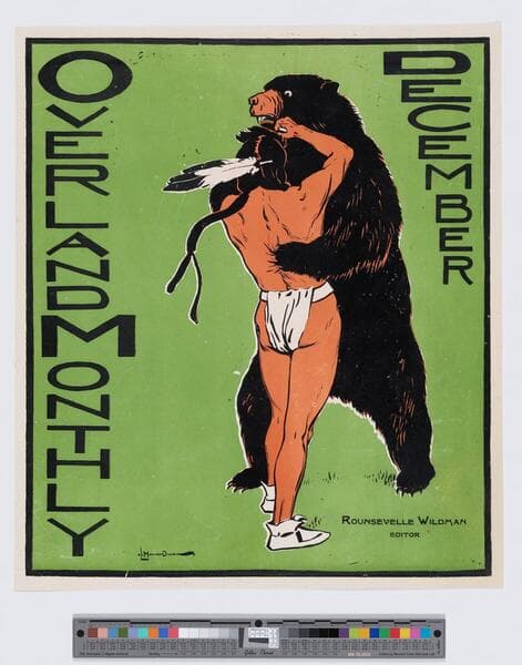- Image of an advertisement for Overland magazine December 1895 issue featuring a Native American Indian man in a loincloth grappling with a bear.