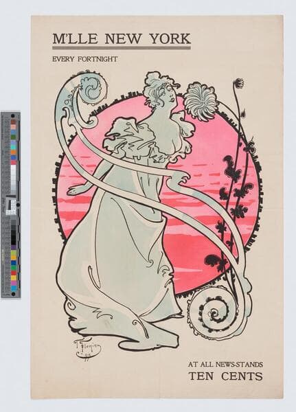 - Image of an advertisement for M'lle New York magazine featuring a full-length portrait of a woman in formal dress; botanical embellishments.