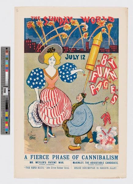 - Image of an advertisement for the Sunday World issue from July 12, 1896; a woman wearing an American flag inspired dress lights a large firecracker held by a small caricature of a Chinese American man with fireworks tied to the end of his braid; city skyline with fireworks exploding in background.