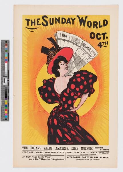 - Image of an advertisement for the Sunday World issue from October 4, 1896; a woman wearing a hat with flowers and a polka-dotted dress with puffed sleeves holds up a issue of the World paper pleated like a fan and rests her other hand on her hip, as though posing in a dance; radiant sun in background.