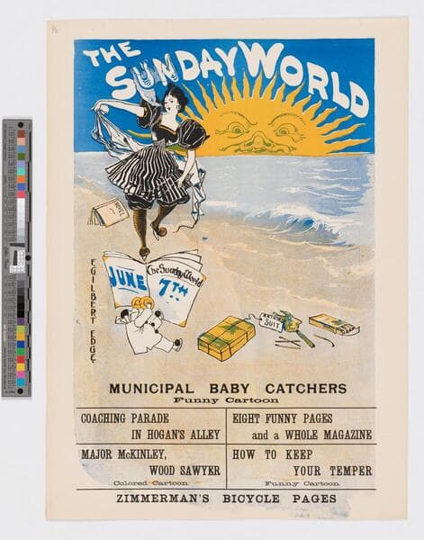 - Image of an advertisement for the Sunday World issue from June 7, 1896; a woman wearing black and white dress walks on the beach, smoking and dancing; small clown with a cymbals sits among items scattered on the beach and holds a copy of the Sunday World; a sun with a face looks over the horizon in background.