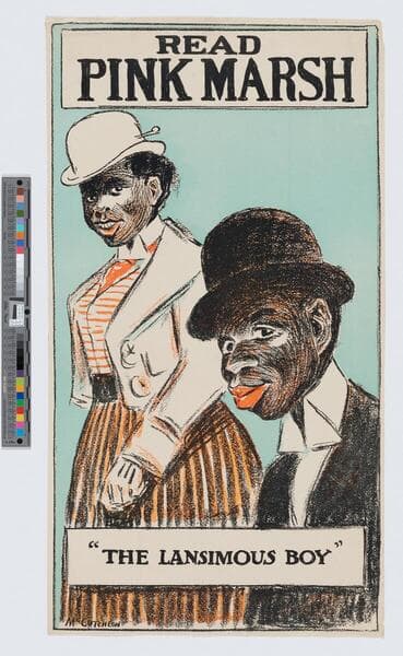 Image of an advertisement for M'lle New York magazine featuring a bust-length portrait of a woman and a male crowned pig in formal wear.