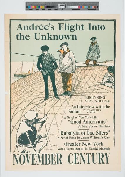 - Image of an advertisement for the Century Magazine November 1897 issue; Solomon August Andree and several other men check ropes for his hot air balloon expedition to take a hydrogen balloon straight over the North Pole; ship in background at left.