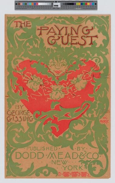 - Image of an advertisement for The Paying Guest by George Gissing featuring a woman's face above a large heart amid scrolling foliage and flowers.