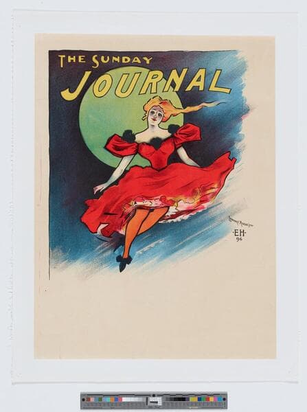 - Image of an advertisement for the Sunday Journal periodical; a seated woman in a red dress in pictured in a night sky with a large full moon behind her.