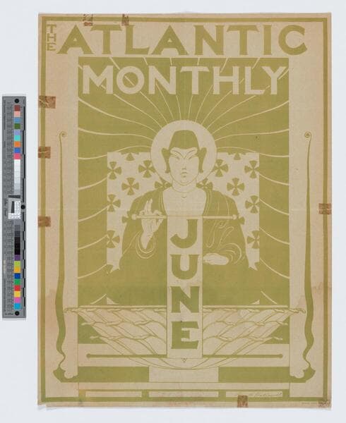 - Image of an advertisement for the Atlantic Monthly June 1895 issue; central figure of a seated Buddha holding a banner with stylized sun rays in background.