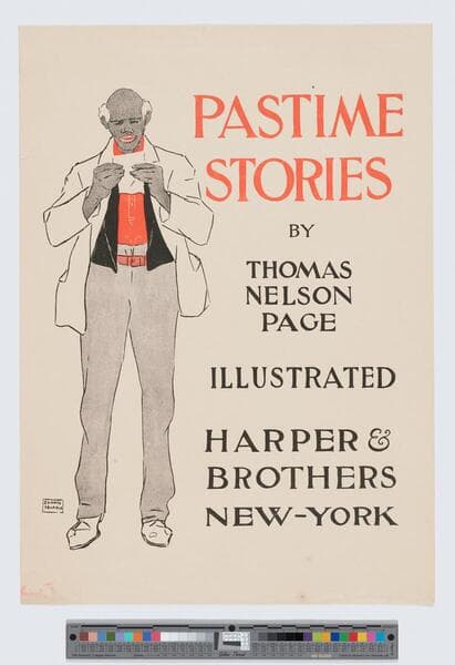 - Image of an advertisement for Pastime Stories by Thomas Nelson Page featuring a balding African American man standing reading a letter.