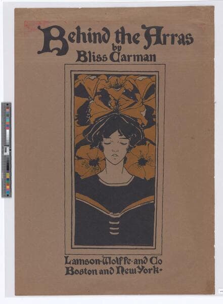 - Image of an advertisement for Behind the Arras by Bliss Carman featuring a bust-length image of a young woman with eyes cast downward reading a book; lily flowers above her head in background.