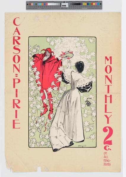 - Image of an advertisement for Carson Pirie Monthly periodical; a woman in a long elegant dress stands facing the devil, who offers her a hat in his outstretched hand as she drops her book with a cross on the cover; flowers surround the two figures.