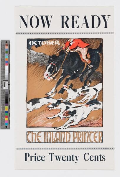 - Image of an advertisement for the Inland Printer magazine for October featuring a hunting scene with a male rider on horseback and a pack of dogs running across a field.