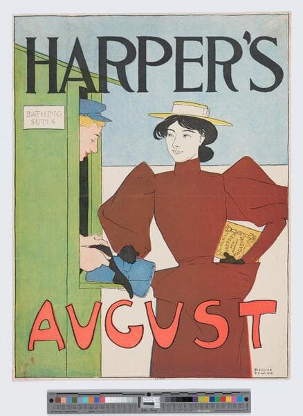 - Image of an advertisement for Harper's magazine August 1894 issue featuring a woman standing at a kiosk being offered a bathing suit by the young man inside the window; the woman holds a copy of Harper's in one hand.
