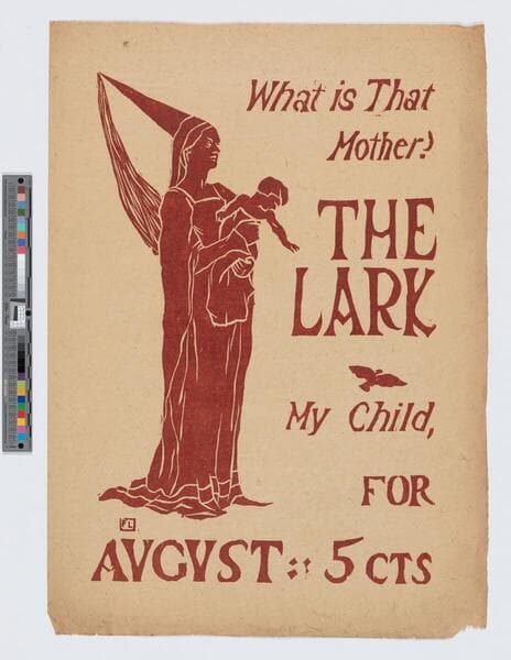 - Image of an advertisement for The Lark magazine August 1895 issue; a woman wearing a flowing gown and hennin hat holds a baby in her arms, who reaches for the advertising text.
