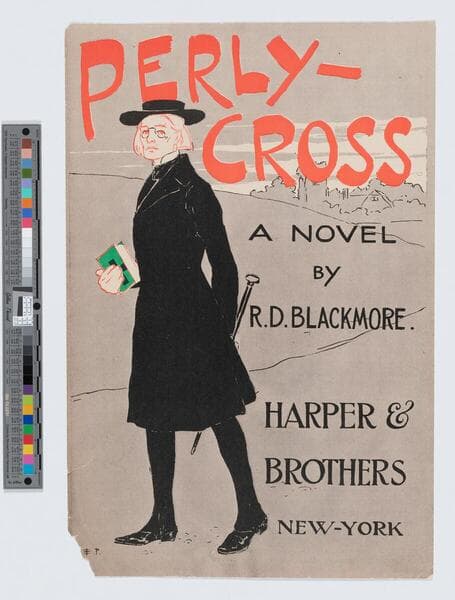 - Image of an advertisement for Perly-cross by R.D. Blackmore featuring Reverend Philip Penniloe walking with a Bible in one hand and a walking stick in the other; town in background at right.