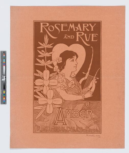 Image of a patriotic Irish message of protest against the British government; half-length portrait of Irish revolutionary Robert Emmet portrayed as a martyr with rays emanating from the portrait; large golden lyre with twining clover tipped with a pair of angels holding scrolls with the names of Irish patriots; heart at bottom center that reads "Liberty."