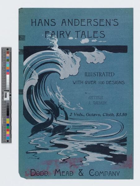 - Image of an advertisement for Hans Andersen's Fairy Tales by Arthur J. Gaskin; three dolphins swim in crashing waves at left.