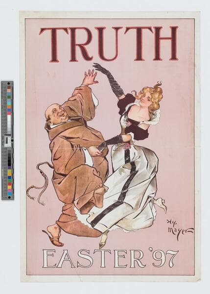 - Image of an advertisement for Truth magazine Easter 1897 issue; a laughing friar in brown robes and a woman in an elegant gown and full-length gloves dance together at center.