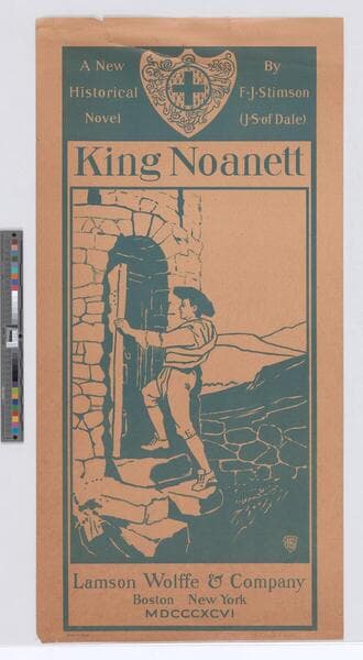 - Image of an advertisement for King Noanett by F. J. Stimson featuring a man walking in the door of a stone tower; heraldic shield at top center.