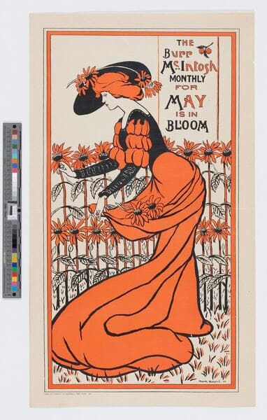 - Image of an advertisement for the Burr McIntosh periodical May 1903 issue; woman in an elegant dress and flower-adorned hat picks flowers in a garden, using her skirt to hold them.