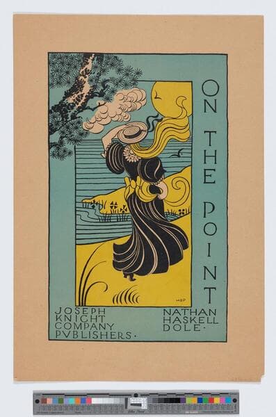 - Image of an advertisement for On the Point by Nathan Haskell Dole featuring a woman walking along the shore with her hair blowing in the wind; she holds her straw hat on her head with on hand; reeds along the shore and birds silhouetted against the sun in background.