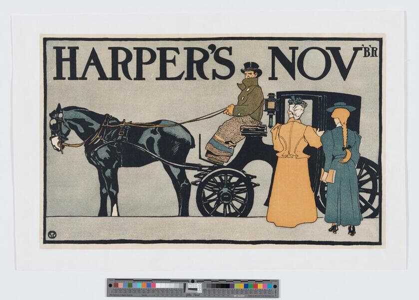 - Image of an advertisement for Harper's magazine November 1898 issue featuring two women getting into a horse-drawn carriage; a driver with a blanket over his lap holds the reins and waits for the women.