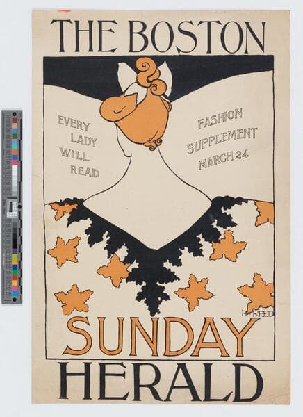 - Image of an advertisement for the Boston Sunday Herald March fashion supplement issue featuring a woman reading; leaves are printed on her dress.