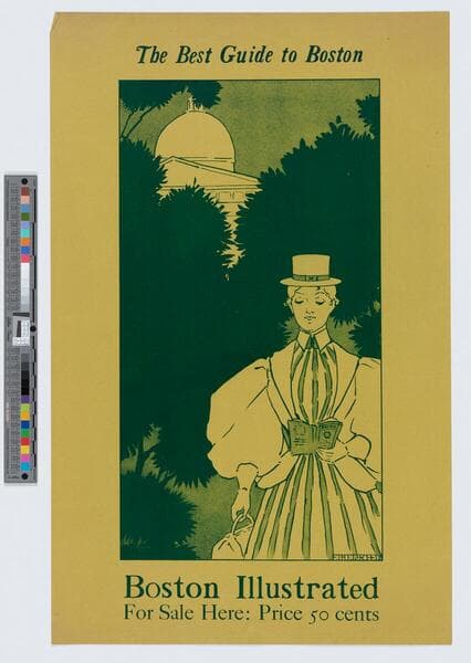 - Image of an advertisement for the Boston Illustrated city guide featuring a woman wearing a long dress with puffed sleeves walking while reading the city guide to Boston, Massachusetts; Boston Capitol Building in background at left.