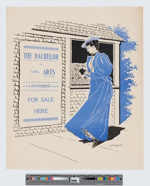 - Image of an advertisement for the Bachelor of Arts November 1896 issue featuring a woman wearing a long dress and hat opening her wallet to purchase a periodical at a newsstand or storefront.