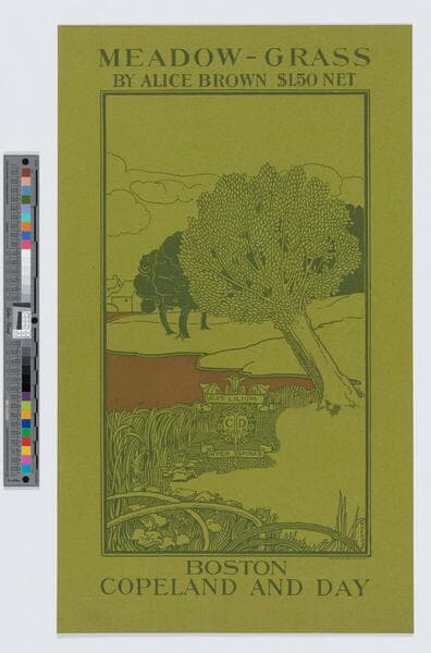 - Image of an advertisement for Meadow-grass by Alice Brown featuring a landscape made up of trees near the shore of a lake or stream; publisher's insignia with Latin expression and monogram at center.
