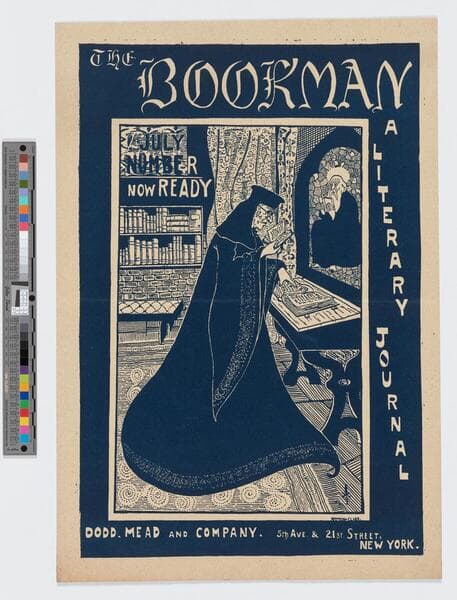 - Image of an advertisement for The Bookman literary journal featuring a scholar standing at a desk consulting two books.