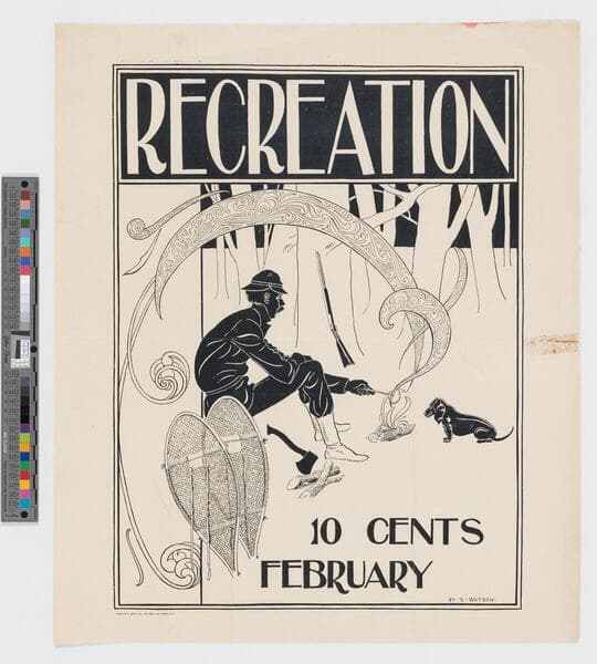 - Image of an advertisement for Recreation magazine February 1896 issue featuring a man sitting in a snowy forest cooking over a campfire with his dog; rifle and hatchet with firewood nearby; snowshoes leaning in foreground.