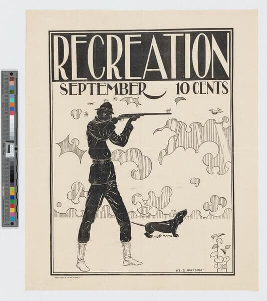 - Image of an advertisement for Recreation magazine September 1896 issue featuring a man aiming a rifle hunting with his dog; stylized forest in background.