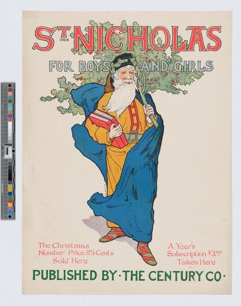 - Image of an advertisement for St. Nicholas magazine featuring Saint Nicholas or Santa Claus standing with books in hand and a large bough of holly over his shoulder.